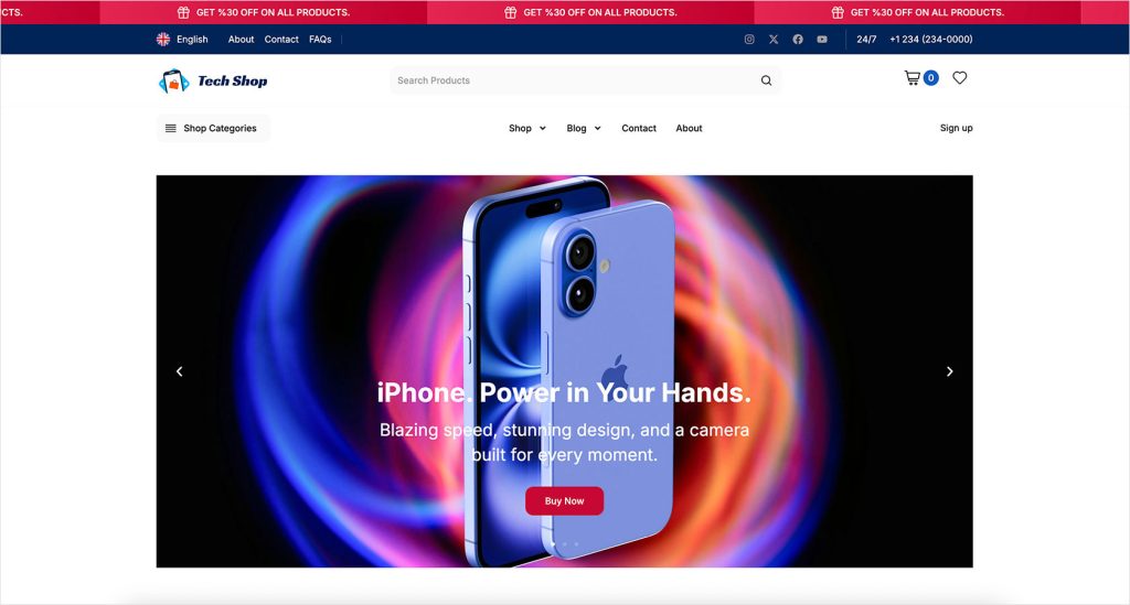 A modern tech-focused storefront ideal for electronics, gadgets, and accessories, with clean layouts and strong product highlights.