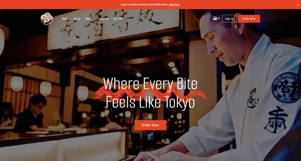 A visually rich restaurant template perfect for sushi bars and modern dining experiences, including menus and reservations.